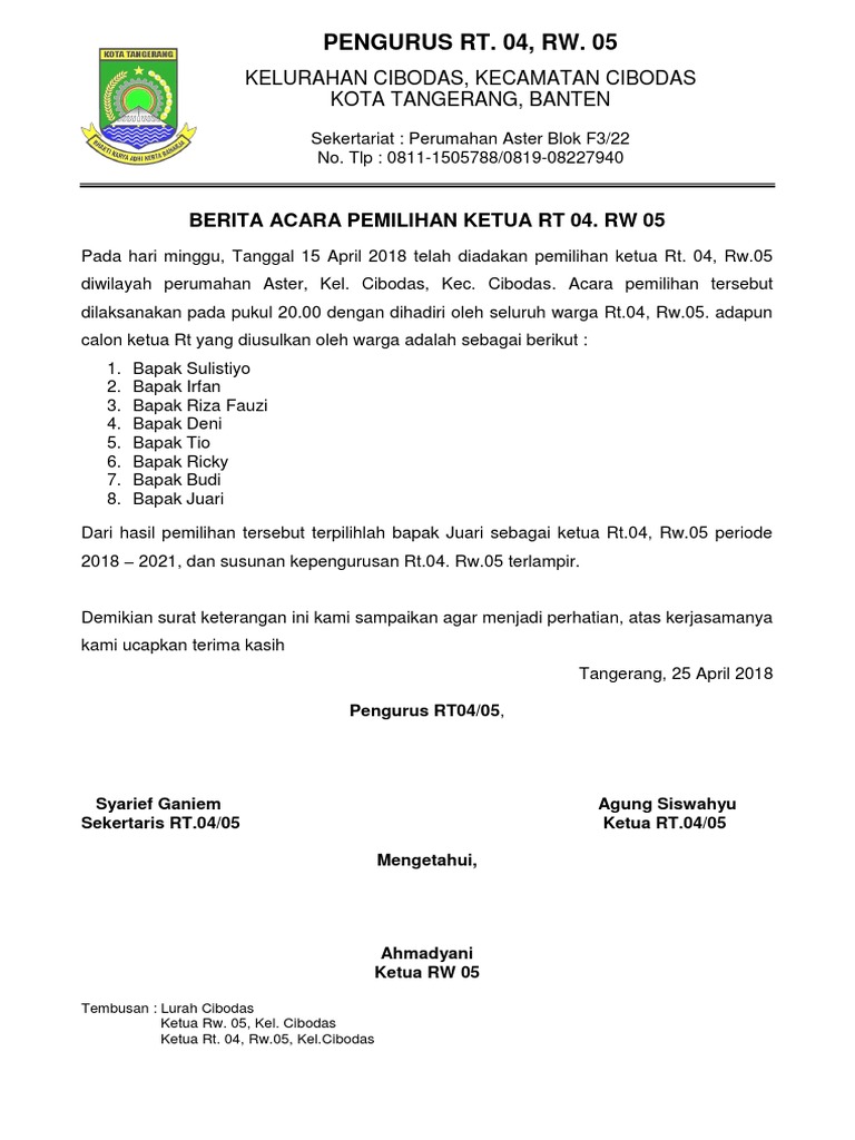 Surat Berita Acara Pemilihan Rt. : Contoh Berita Acara Hasil Pemilihan Rt - Contoh Oren - Berita acara panitia pelatihan kepemimpinan.. Pemilihan langsung ketua rt 007/08 kel. Contoh surat berita acara penyelesaian pekerjaan. Panitia pemilihan ketua rw.05 kelurahan sunter agung. Masjid jami nur iman acara : Sementara contoh lainnya yaitu di kota tangerang, prosedur penggantian ketua rt yang mengundurkan diri dari jabatan ini.